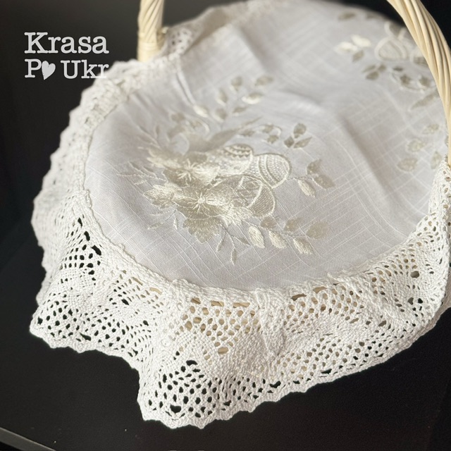 #232 Вишита серветка на пасхальний кошик «Тріо писанок», білий льон – 60*40 см – «молочним по білому» або «білим по білому»