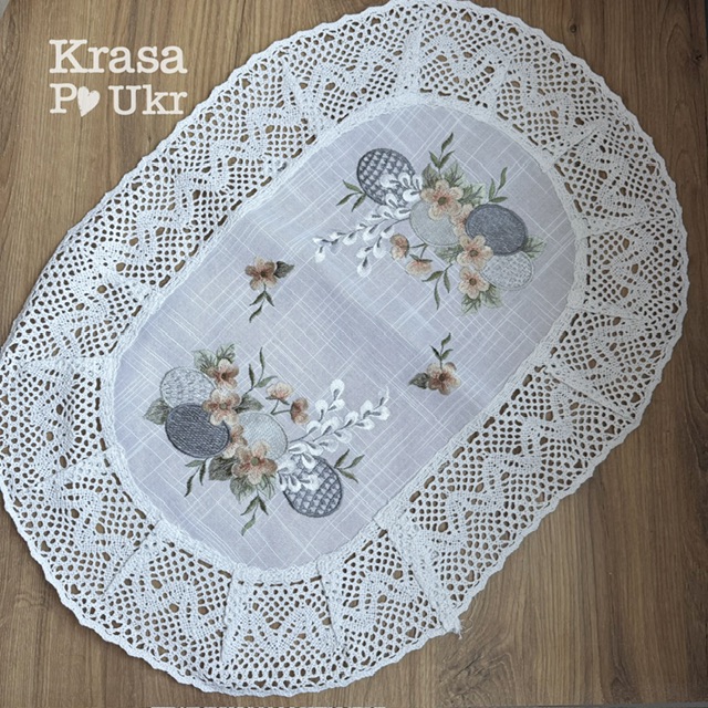 По краю рушник оздоблений ажурним мереживом, яке додає виробу легкості та традиційного характеру. Овальна форма красиво обрамляє кошик і підкреслює його форму, створюючи охайний та завершений вигляд під час освячення.