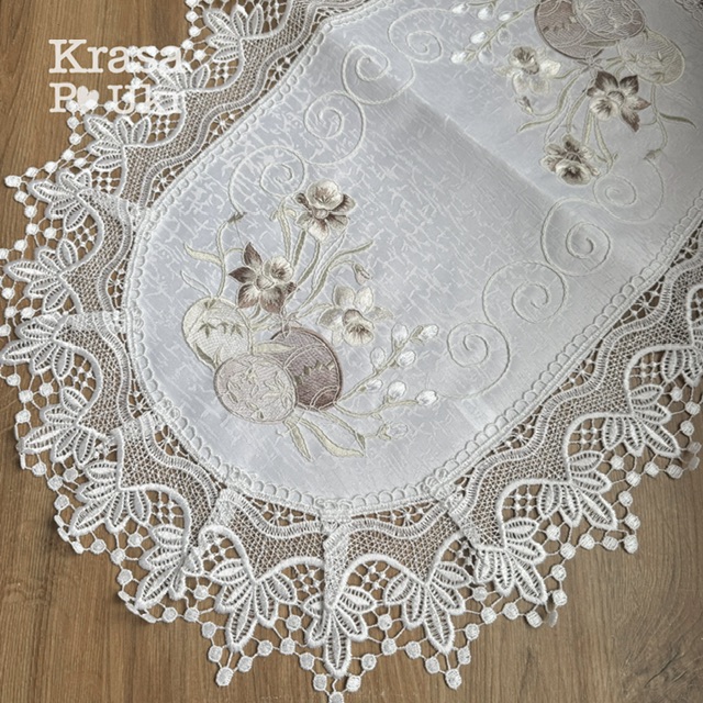 По краю серветка оздоблена витонченим ажурним мереживом, яке підкреслює овальну форму та додає виробу святкової легкості. Розмір 60×40 см є універсальним для середніх і великих кошиків. Варто враховувати, що овальні серветки візуально виглядають трохи меншими за прямокутні того ж розміру через округлі краї.