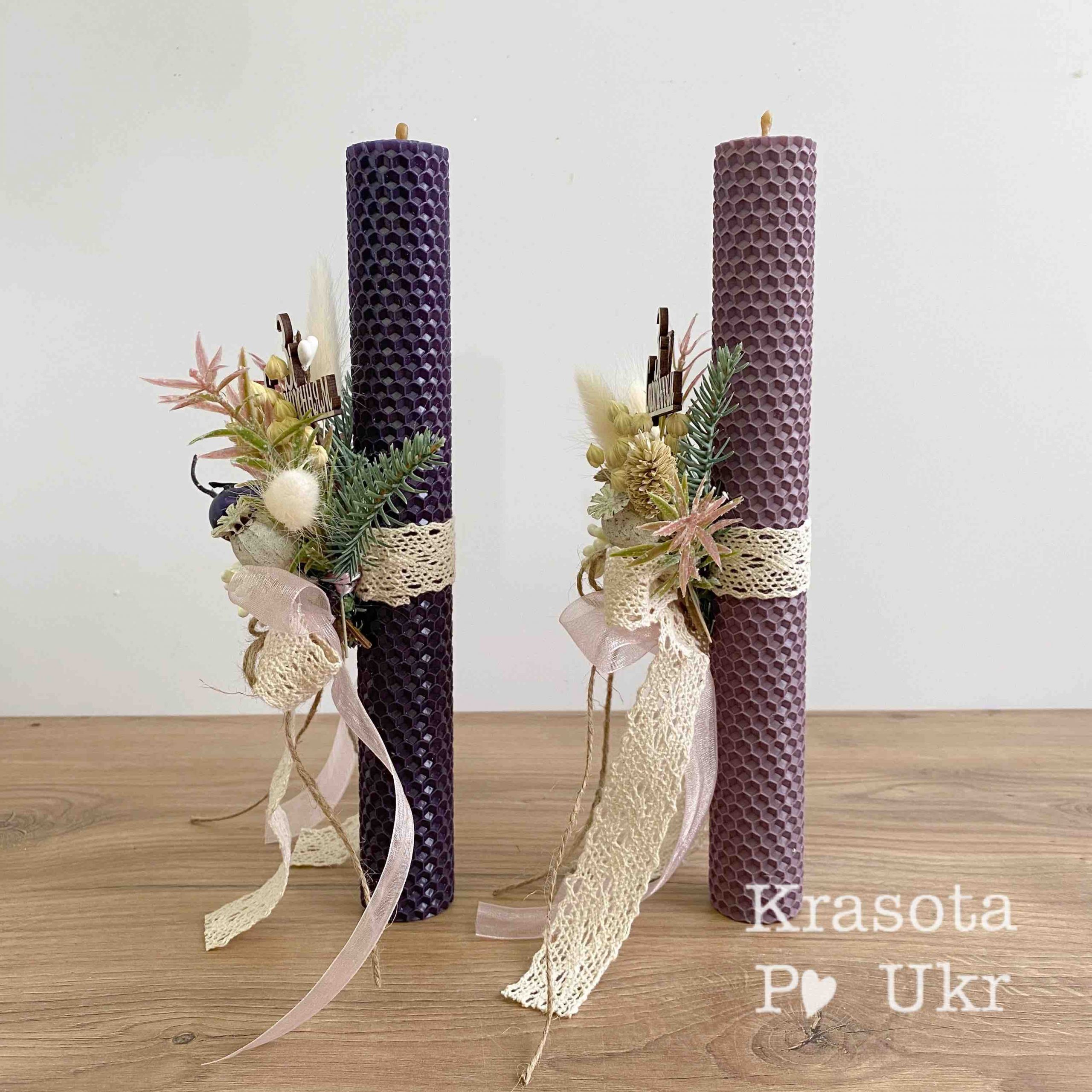 Свічка з вощини – лаванда та аметист мають неймовірний запах і виглядають, як соти у вулику, тому в народі їх ще називають медовими.