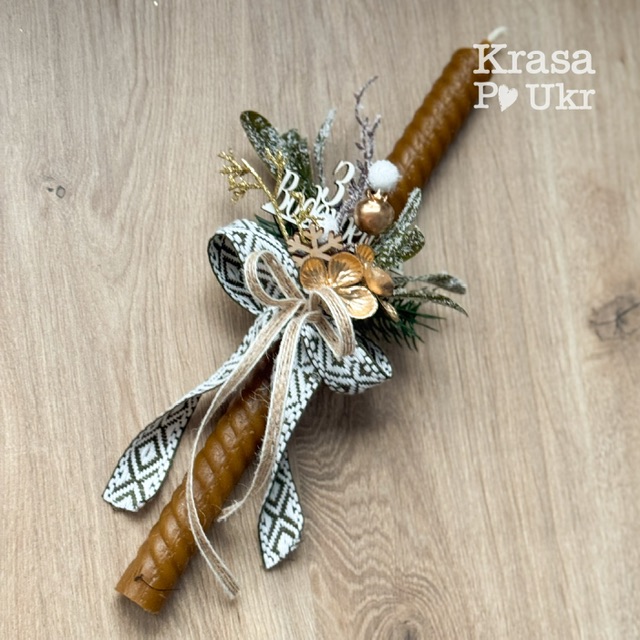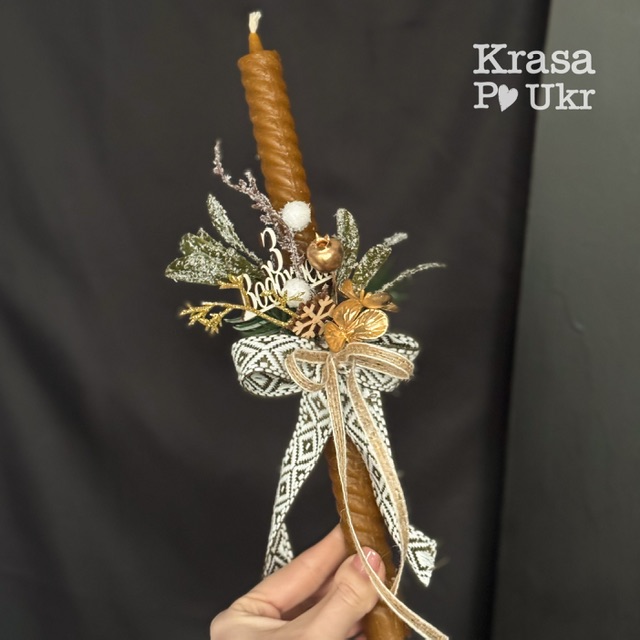 Стрітенська воскова свічка “золоте благословення” — символ світла, миру та Божого захисту для дому. Свічка виготовлена з натурального воску, має приємний медовий аромат і декорована у стриманій святковій палітрі: молочно-золота гама, вишивана стрічка з традиційним орнаментом, натуральна мотузка, декоративні елементи та святковий напис «Зі Стрітенням». Поєднання природних матеріалів і мінімалістичного декору робить свічку універсальною — для освячення на Стрітення Господнє або як подарунок з глибоким змістом.