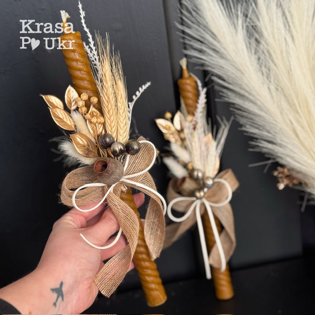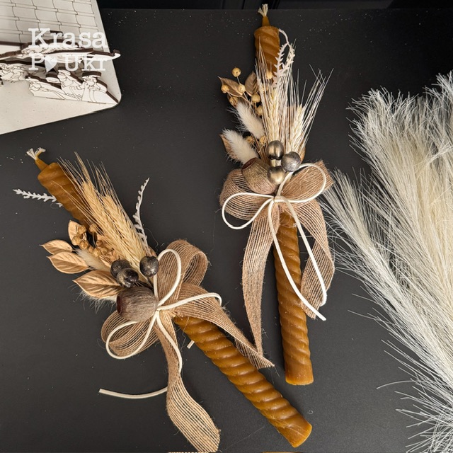 Стрітенські свічки з натурального воску — це поєднання давньої традиції, природної краси та глибокого символізму. Свічки виготовлені з воску, мають медовий аромат і прикрашені стриманим натуральним декором: сухоцвітами, колосками, декоративними елементами та лляними стрічками у природних відтінках.