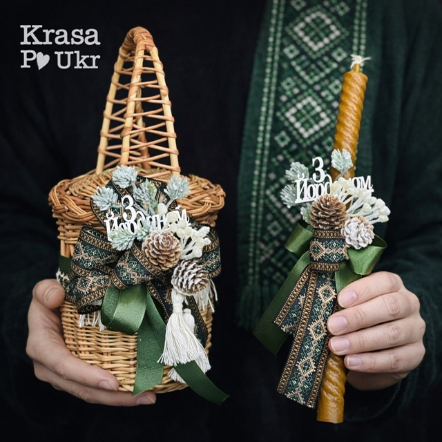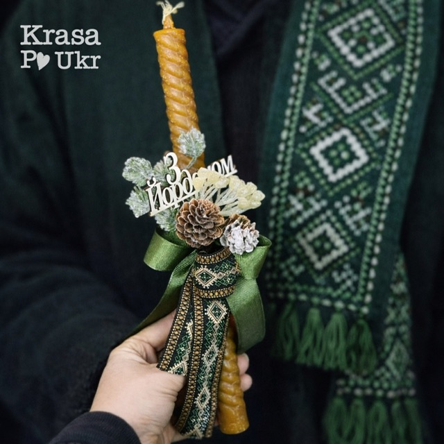 Стрітенська свічка з декором у дизайні «Вишиванка» — символічна воскова свічка для Водохреща (Йордана) або Стрітення. Виготовлена з натурального воску та прикрашена автентичним декором у смарагдовій гамі, що відсилає до українських традицій і святкової символіки. Орнамент у стилі вишиванки, декоративна стрічка, натуральні елементи та напис «З Йорданом» або “Зі Стрітенням” на вибір – створюють урочистий і водночас стриманий образ. Довжина 30 см робить свічку зручною для освячення води, молитви та збереження в домі як оберегу. Свічка гармонійно поєднується з кошиком на банку з цієї ж колекції, але може використовуватись і як самостійний обрядовий елемент.