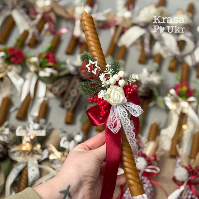 Свічка воскова 30*2 см або прикраса до Стрітення, дизайн “калина-троянда”