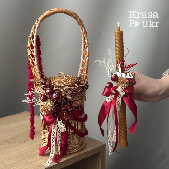 Стрітенська воскова свічка “Червоний оберіг” — символ світла, захисту та благословення для дому. Виготовлена з натурального воску, має теплий медовий аромат і декорована у традиційній червоно-молочній гамі. Святковий декор поєднує атласні стрічки, мереживо, декоративні ягоди та напис «Зі Стрітенням». Червоний колір символізує життєву силу, тепло й охорону дому. Свічка підходить для освячення на Стрітення Господнє, домашньої молитви або як символічний подарунок із традиційним українським змістом.
