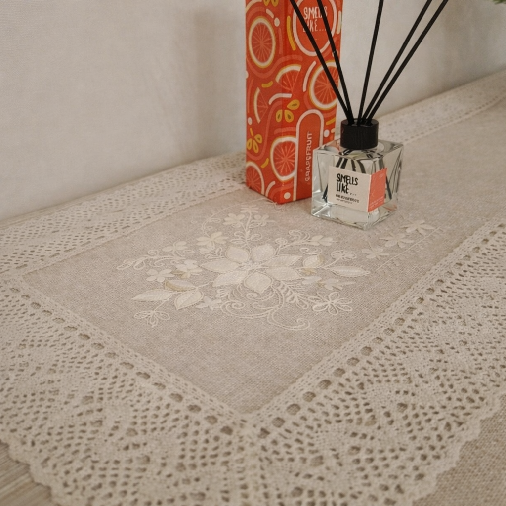 #155 Доріжка на стіл, дизайн “молочні квіти”, натурального кольору з широким мереживом 90 см, 150 см, 180 см, 220 см