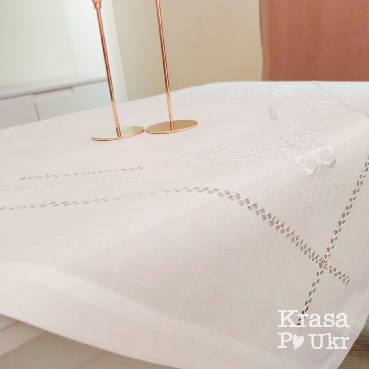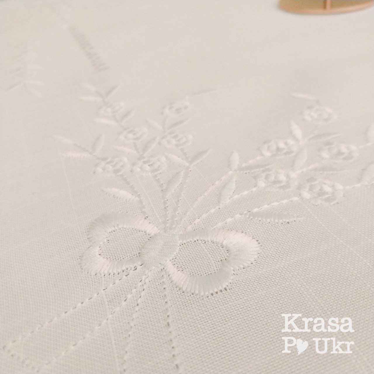 #019A Скатертина лляна біла 90×90 см з вишивкою та класичним кантом