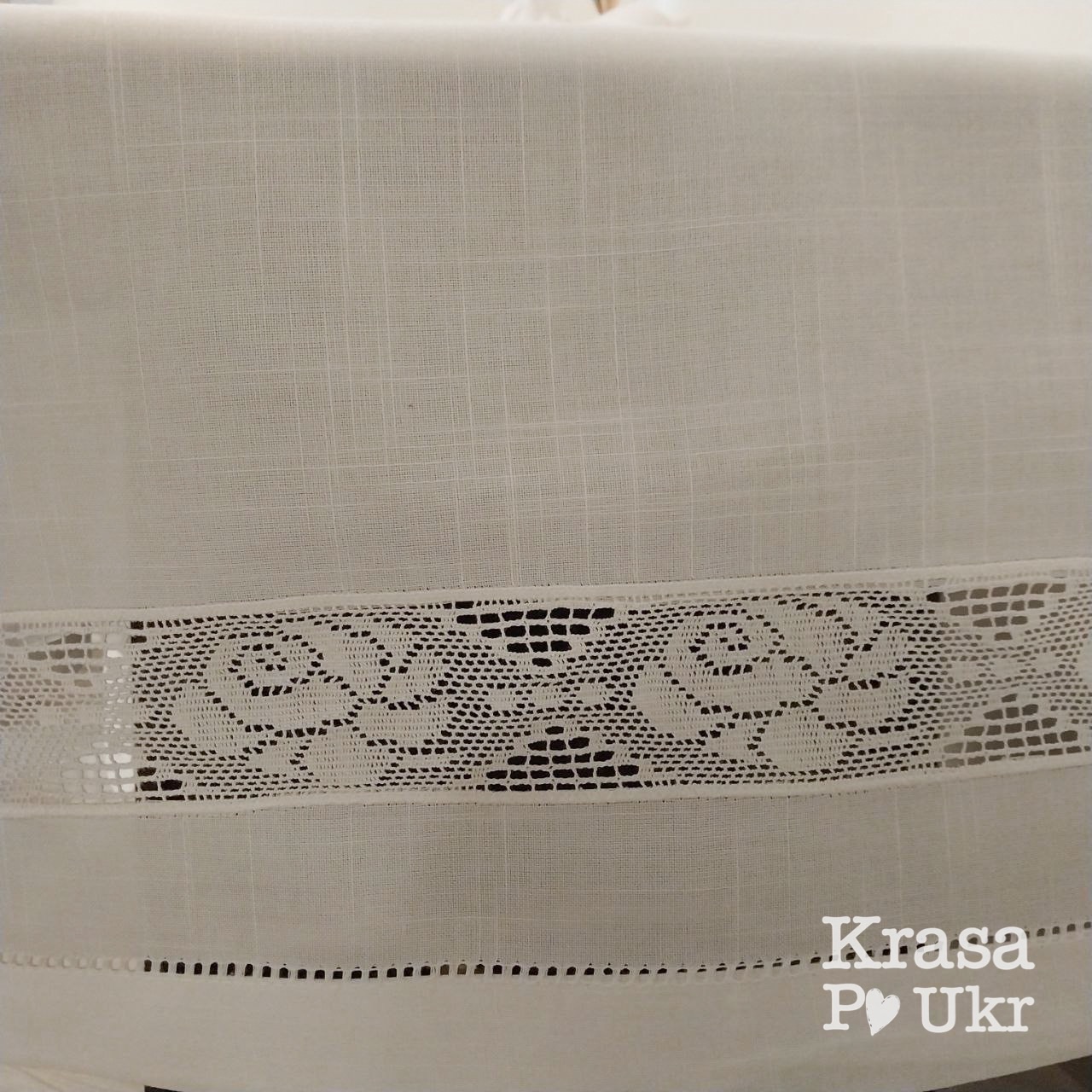Особливим акцентом є ажурна мереживна вставка, виконана у техніці вставної мережки. Вона проходить по периметру скатертини, додаючи виробу легкості й вишуканості, не перевантажуючи загальний вигляд. Білий колір підкреслює чистоту мережива та робить скатертину універсальною — вона однаково доречна як для святкового сервірування, так і для повсякденного використання.