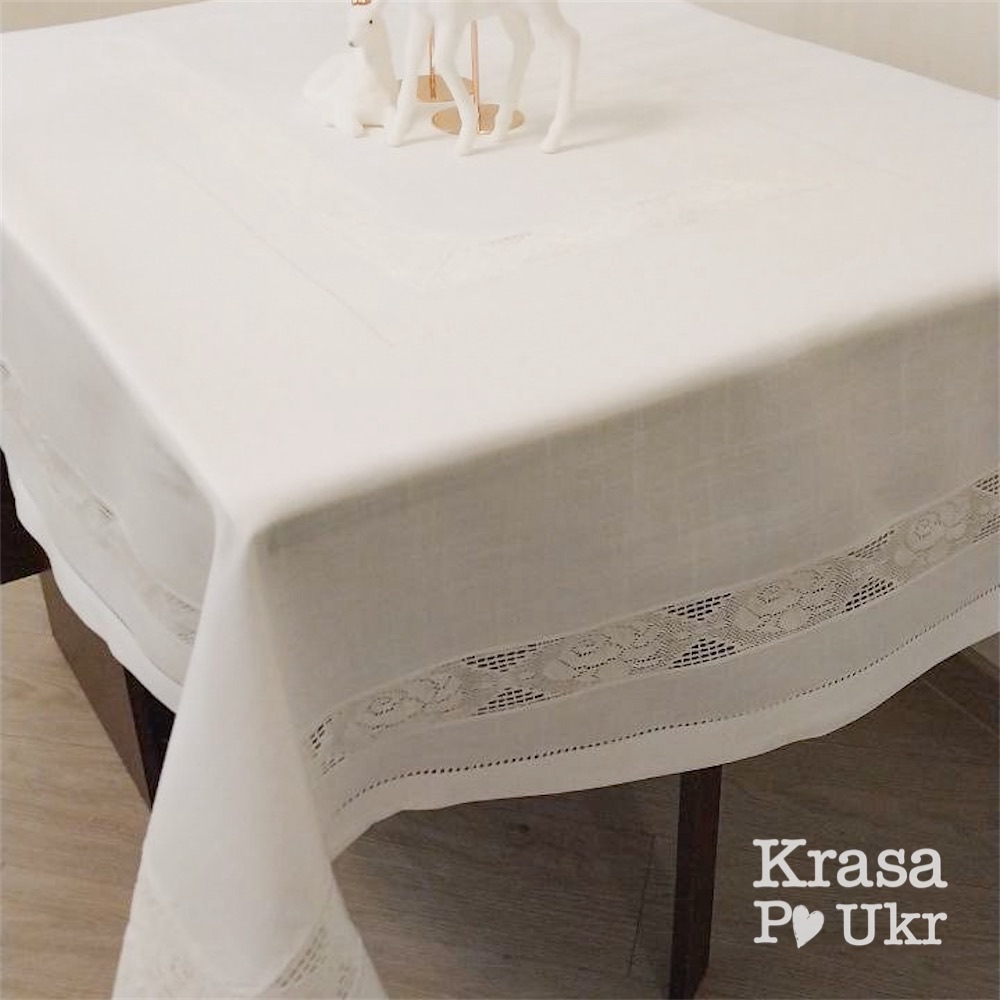 #2317 Скатертина лляна (180*135 см), біла – з ажурною мереживною вставкою