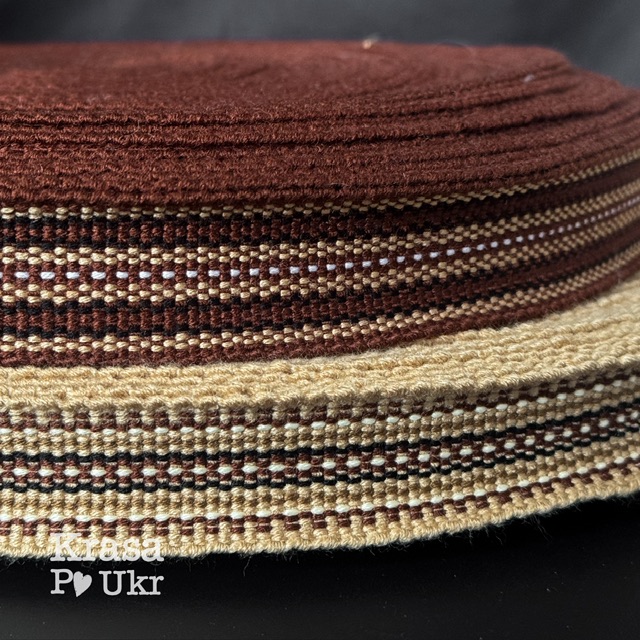 Текстильна крайка у м’якому поєднанні шоколадного та бежевого відтінків — стриманий етно-акцент для великоднього кошика, декору й творчих проєктів. Гармонійно доповнює натуральну лозу, льон і пастельні композиції.