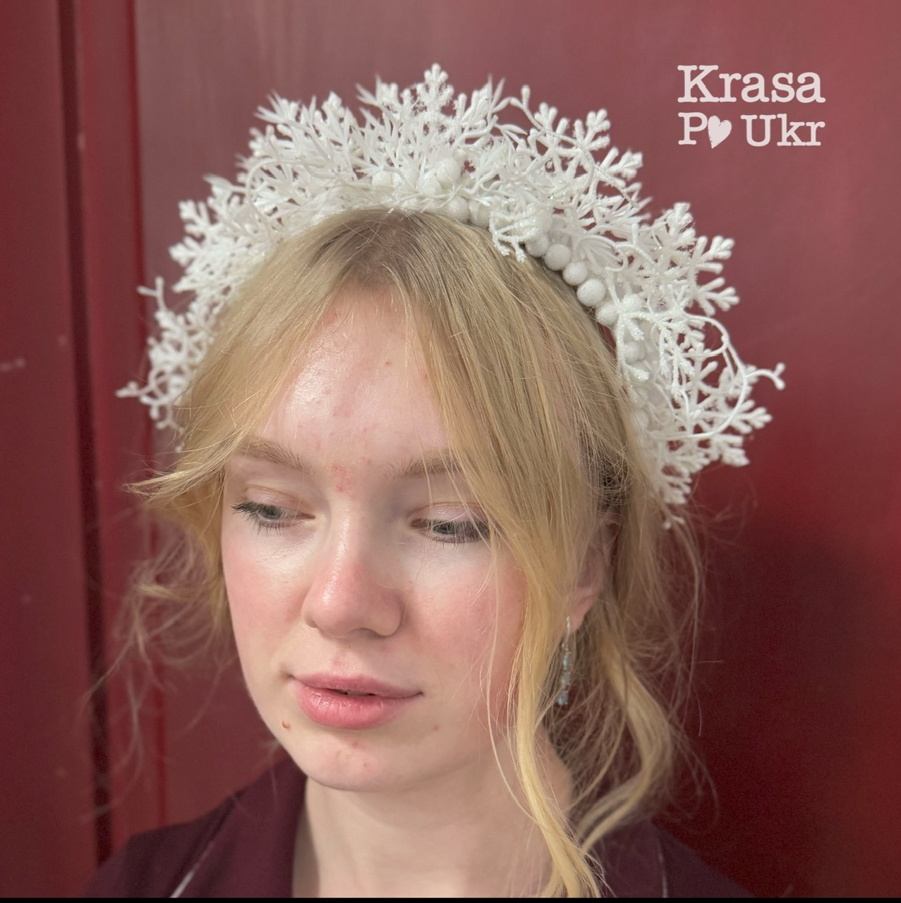 Обруч виконаний у світлій зимовій палітрі та прикрашений сніжинками, які красиво вловлюють світло під час руху. Декор легкий, але міцний, надійно закріплений і не створює відчуття дискомфорту навіть при тривалому носінні. Основа – обруч, повторює форму голови та не тисне.