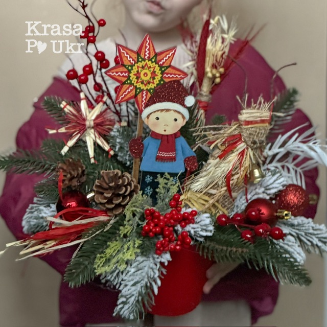 Різдвяна композиція «Колядничок з дідухом» створена спеціально для шкільних та садочкових свят, саморобок, а також для святкового оформлення дому. В центрі — колядник зі зіркою, поруч міні-дідух та солом’яні елементи-обереги, що підкреслюють українські традиції. Композиція виконана вручну з натуральних та штучних елементів. Виходить об’ємна, яскрава й дуже атмосферна робота, яка відразу привертає увагу.