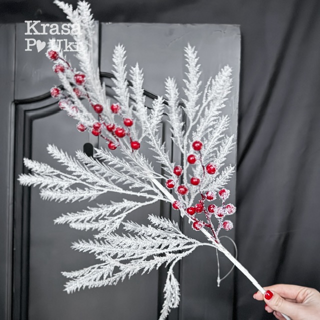 Новорічна хвойна гілка 62 см з калиною, біла хвоя