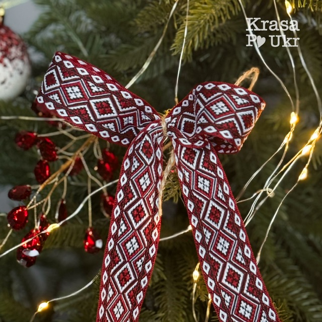 Вишитий бант на ялинку, червоний (21*15 см)