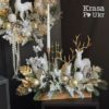 Стильний свічник у дерев’яному кашпо з оксамитовими оленями у золотому дизайні з колекції «Новорічно-Різдвяні Історії». Вишукане поєднання білих і золотих акцентів, засніженої хвої, кульок і декоративних елементів створює теплу святкову атмосферу. Ідеальний декор для столу чи каміну.