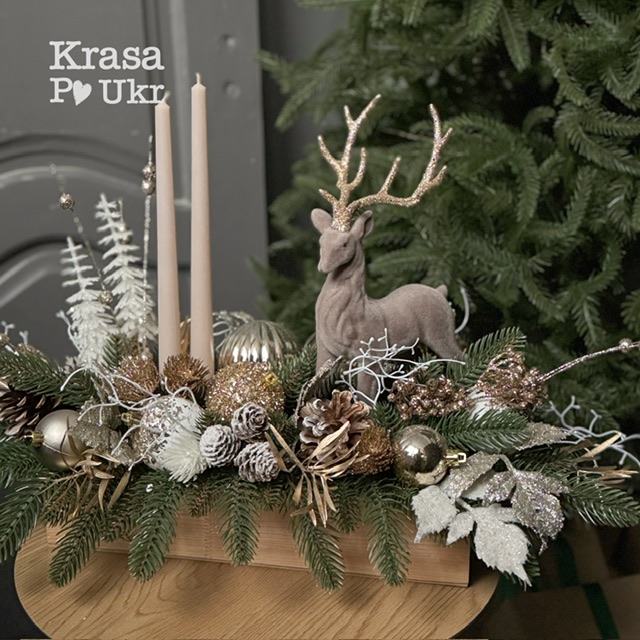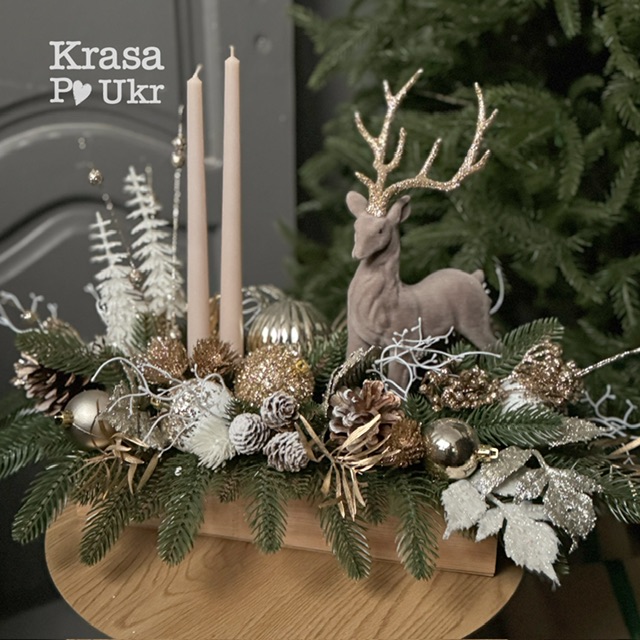 Підсвічник «Зачарований Олень» з колекції «Новорічно-різдвяні історії» у дизайні «Мокко-Золото» — елегантна композиція для святкового інтер’єру. Оксамитовий олень із величними рогами, натуральні шишки, кулі, хвойні гілочки та витончені декоративні акценти створюють ефект справжньої зимової казки. У центрі композиції — дві високі свічки, що додають теплого камерного світла. Ідеально підходить для оформлення святкового столу, каміну чи консолі. Виконано вручну, кожна деталь підібрана для гармонійного святкового образу.