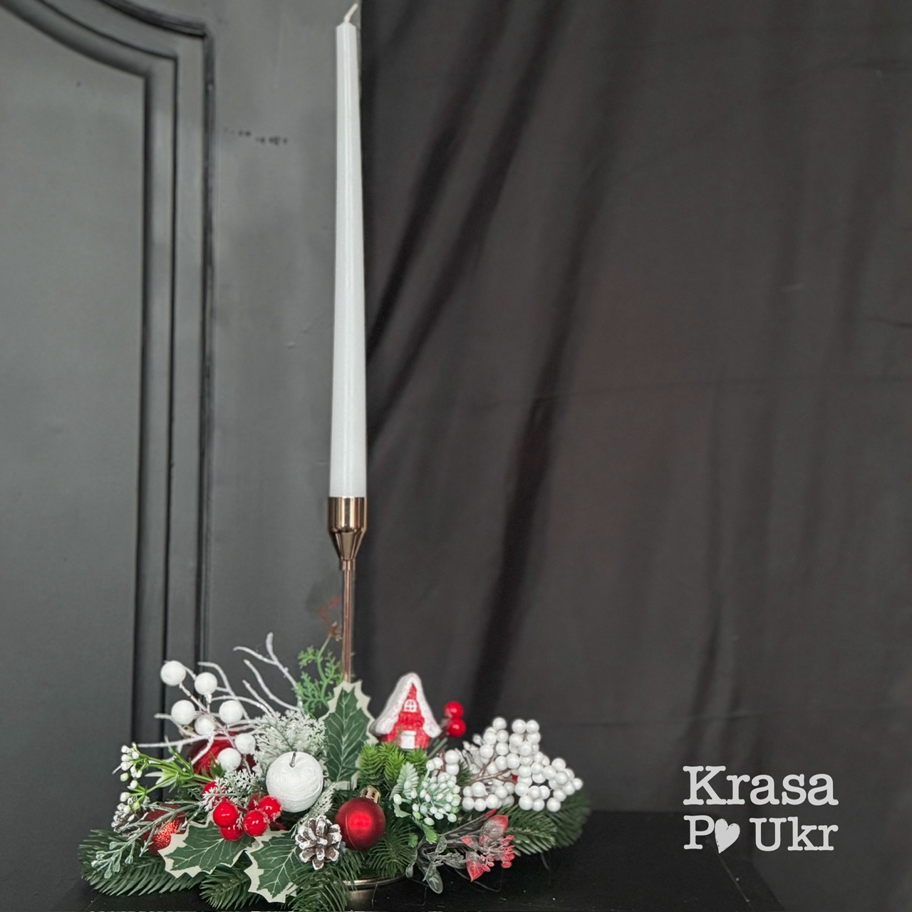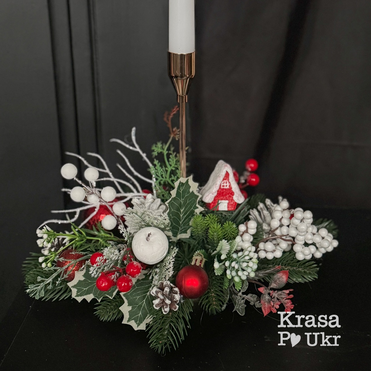 Елегантний різдвяний свічник із колекції «Різдвяна Класика». Декор із білих, червоних та зелених акцентів, ягідок, шишок, будиночка та святкових елементів створює чарівну атмосферу свята. Ідеальний декор для столу, каміна або затишної різдвяної зони.