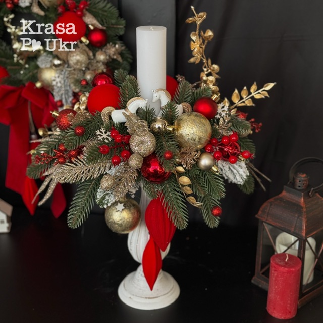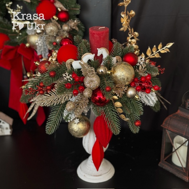 Елегантний різдвяний підсвічник ВІТНАЖ у класичному поєднанні червоного та золота — виразний акцент для святкового столу та затишного інтер’єру. Композиція виконана з литої хвої та декоративних елементів у традиційній різдвяній палітрі: кулі, ягоди, золотисте листя й акценти, що створюють відчуття тепла та урочистості.