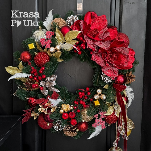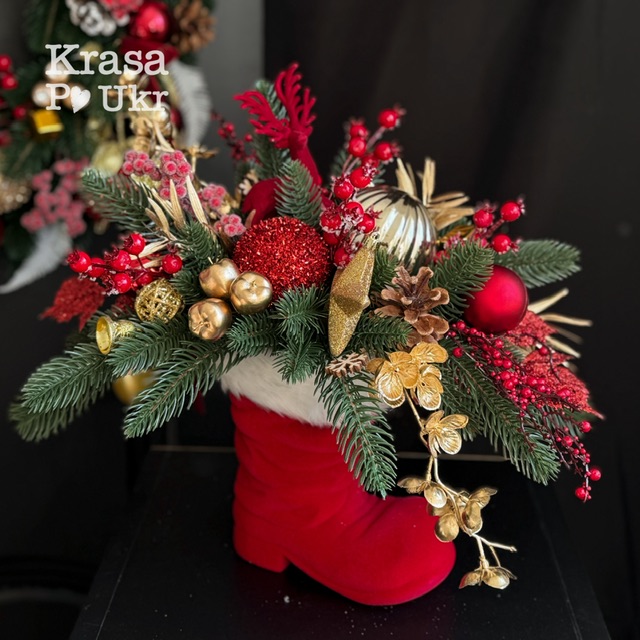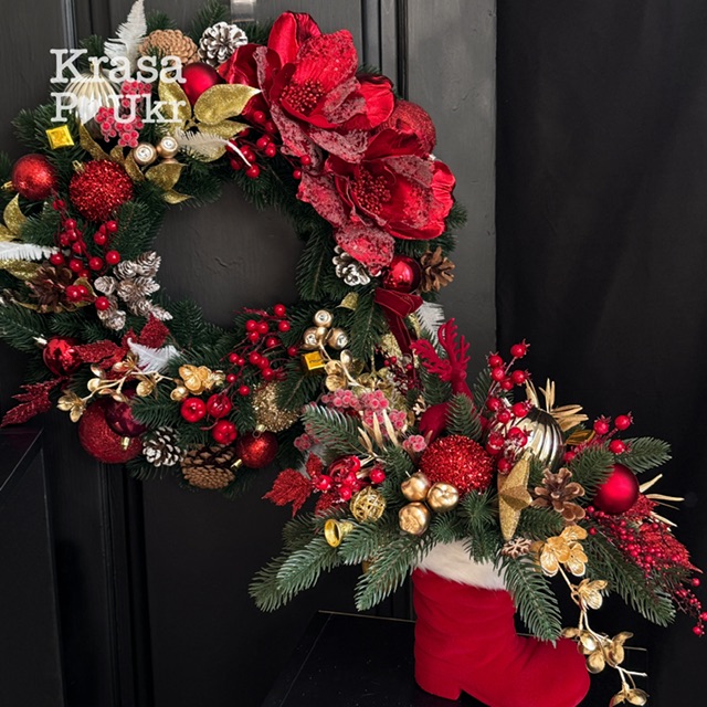 Новорічний комплект – композиція в чобітку та вінок, “Різдвяна класика”, дизайн «червоне-золото»