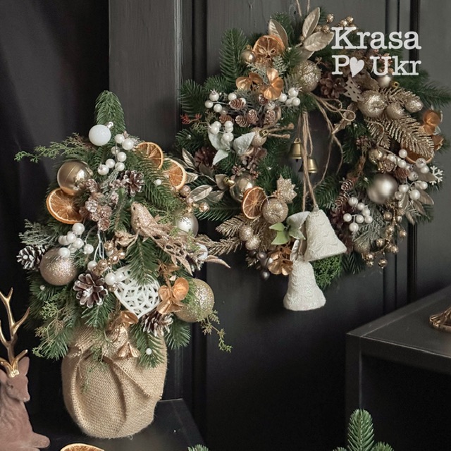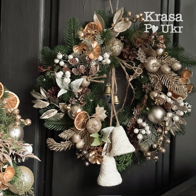 Вінок виконаний на основі литої хвої преміум-якості, прикрашений сушеними апельсинами, корицею, золотими акцентами, білими дзвониками, декоративними кулями та шишками. Гармонійне поєднання шампань, золота, білого та природних відтінків створює ефект теплого сяйва, яке асоціюється з ароматом святкової випічки та казкової атмосфери зимових вечорів.