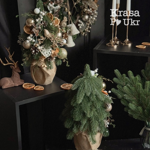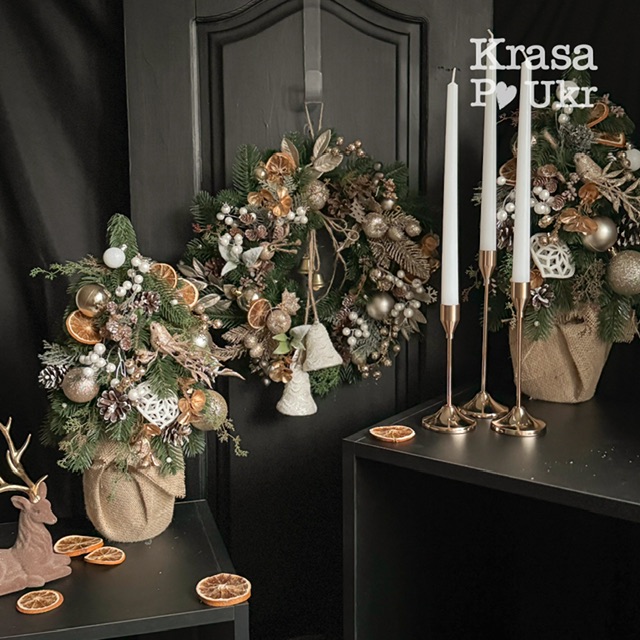 Комплектація: вінок, ялинка 50 см, підсвічники (на вибір)