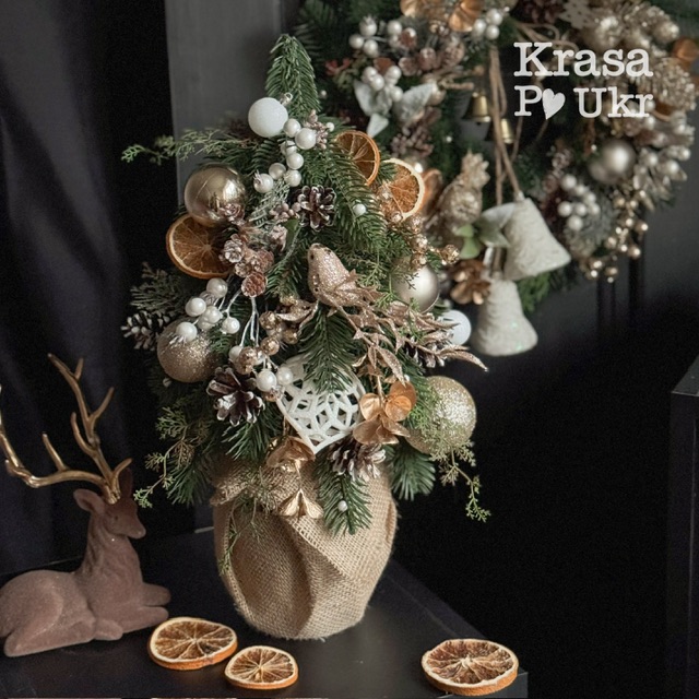 Матеріали: лита хвоя, сушені апельсини, кориця, шишки, декоративні кулі, гілочки, глітерні елементи