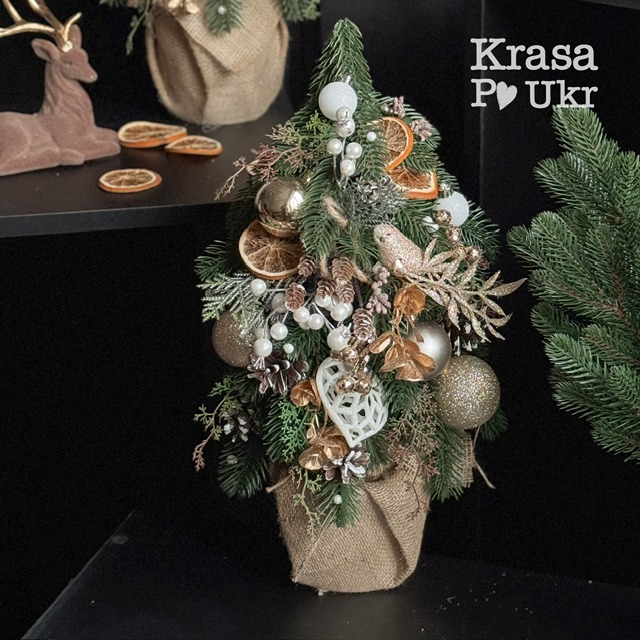 Ялинка — витончена, 50 см заввишки, оформлена у мішковині, що додає їй природності та стилю еко-декору. Вона доповнена сушеними цитрусовими, корицею, шишками, кульками й гілочками — ідеально виглядає на комоді, підвіконні або як частина композиції на столі. Декор односторонній.