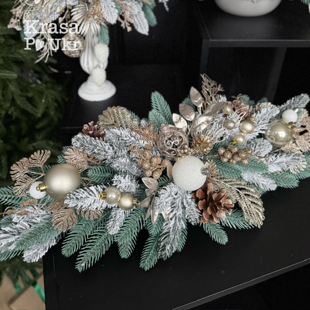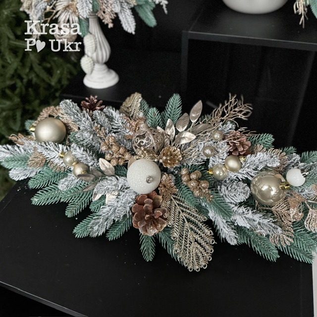 Комплект можна сформувати індивідуально: на фото представлено свічник у вінтажному стилі зі свічкою 10 см, композицію у кашпо, настільну композицію-гірлянду довжиною 65 см та класичний новорічний вінок діаметром 40 см. Кожен елемент гармонійно поєднується між собою, створюючи цілісну атмосферу розкоші та зимової казки. Ідеально для святкового столу, каміну, комодів, входу в оселю чи фотозони.