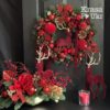 У декорі використані червоні та бордові кулі різного фактурного покриття — глітерні, лаковані, матові й ефект “інію”. Композицію збагачують декоративні ягоди, гілочки, шишки та розкішна червона магнолія, що створює глибину та святковість.