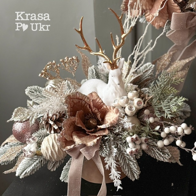 Вишуканий новорічний комплект “Пудра-Шампань” із колекції “Зимова пудра” — це гармонійне поєднання елегантності, теплоти й святкового блиску. Комплект складається з вінка та композиції з оленем, створених вручну у ніжній кольоровій гамі пудри, шампань та білого снігу.