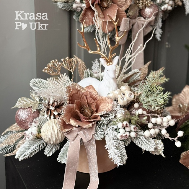 Новорічний комплект – вінок та композиція, колекція «Зимова пудра», дизайн «пудра-шампань»