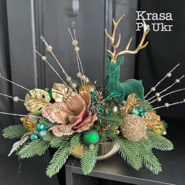 Центральний акцент — оксамитовий смарагдовий олень із розкішними золотими рогами. Він одразу привертає увагу й задає атмосферу казковості, ніби зійшов зі сторінок зимової легенди. Завдяки бархатній текстурі олень виглядає надзвичайно стильним.