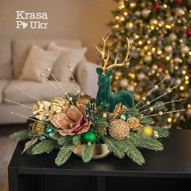 Центральний акцент — оксамитовий смарагдовий олень із розкішними золотими рогами. Він одразу привертає увагу й задає атмосферу казковості, ніби зійшов зі сторінок зимової легенди. Завдяки бархатній текстурі олень виглядає надзвичайно стильним.