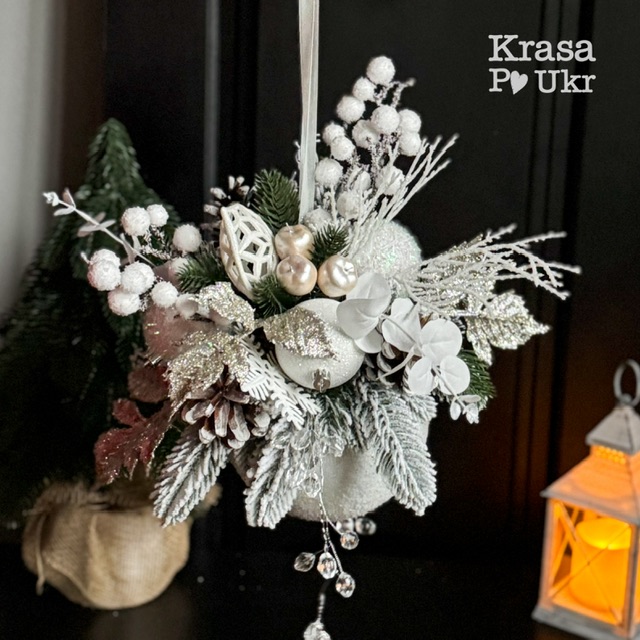 Біла куля-підвіска з декором ручної роботи — це витончена прикраса, яка створює атмосферу зимової казки. Її поверхня нагадує ніжний сніг, що осів на кулі, надаючи виробу вишуканості та м’якості. Виконана у поєднанні білих відтінків і натурально виглядаючої литої хвої, ця куля ідеально підходить для створення спокійного, елегантного новорічного декору.