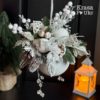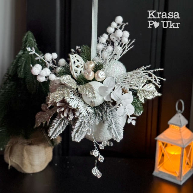 Декор доповнений дрібними елементами, що гармонійно поєднуються з біло-зеленою палітрою: шишками, добавками, гілочками чи цікавинками — кожна деталь продумана до дрібниць. Лита хвоя виглядає наче жива, не обсипається і зберігає “свіжий” вигляд протягом багатьох сезонів.