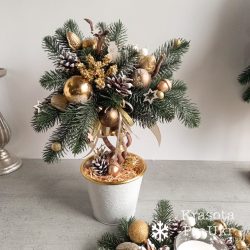 Новорічне деревце в металічному відерку з золотистими кульками, натуральними шишками і жолудями і іншими маленькими деталями, може стати гарною альтернативою ялинці. Деревце з литої хвої, яка дуже схожа на живу. Низ деревця – металічне біле відерко з золотою окантовкою, яка підкреслює колір декору.