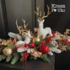 Центральними героями композиції є два вишукані білі олені з велюровою поверхнею та розкішними золотими рогами. Вони додають святковому декору благородності та створюють акцент, який привертає погляд з першої секунди. Завдяки їхній м’якій текстурі та естетичному силуету, композиція виглядає як елемент преміального оформлення, який зазвичай використовують у вітринах бутиків або фотозонах.