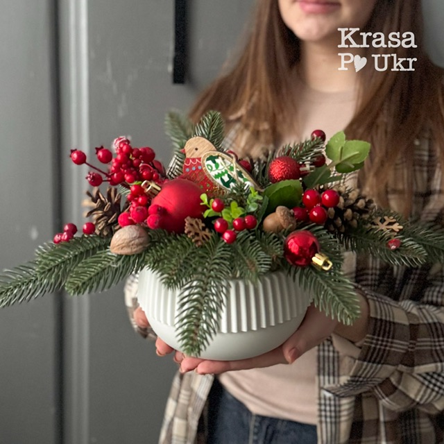 Композиція 30 см кругла ”Різдвяна пташка”, колекція “Різдвяна класика”