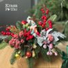 Композиція виконана на основі литої зеленої хвої, прикрашена яскравими акцентами червоного, золотого кольорів, що створюють відчуття тепла, радості й свята.