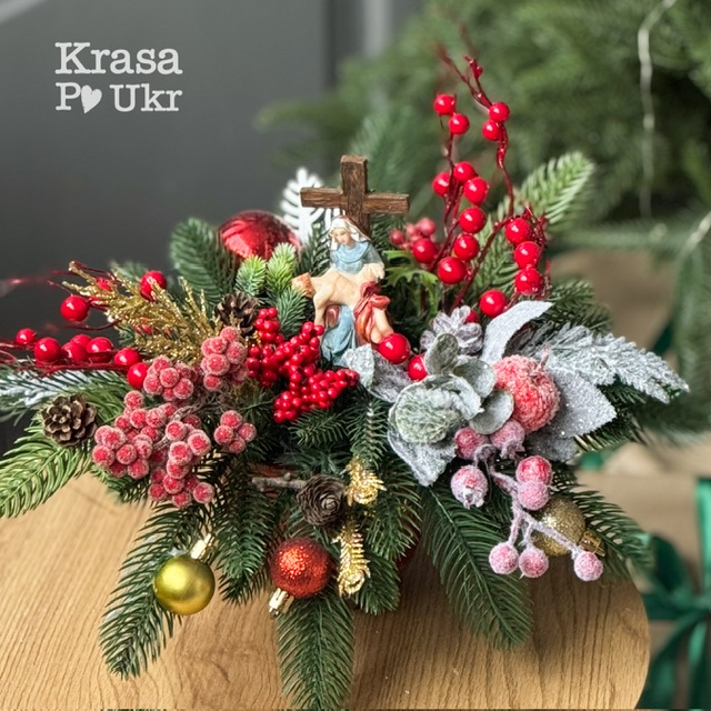 Ця композиція стане чудовим різдвяним акцентом для дому, офісу чи храму, а також зворушливим подарунком для близьких. Вона ідеально поєднується з іншими виробами з колекції “Різдвяна класика” — вінками, гірляндами та свічниками, які можна підібрати у схожій стилістиці на сайті Krasa Po Ukr.