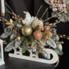 Новорічна композиція «Ароматне Різдво» на дерев’яних санчатах довжиною 40 см. Декор доповнений фігуркою Миколайчика та стильними святковими елементами. Можливе виконання у бажаній кольоровій гамі. На сайті доступні й інші вироби цієї колекції.