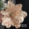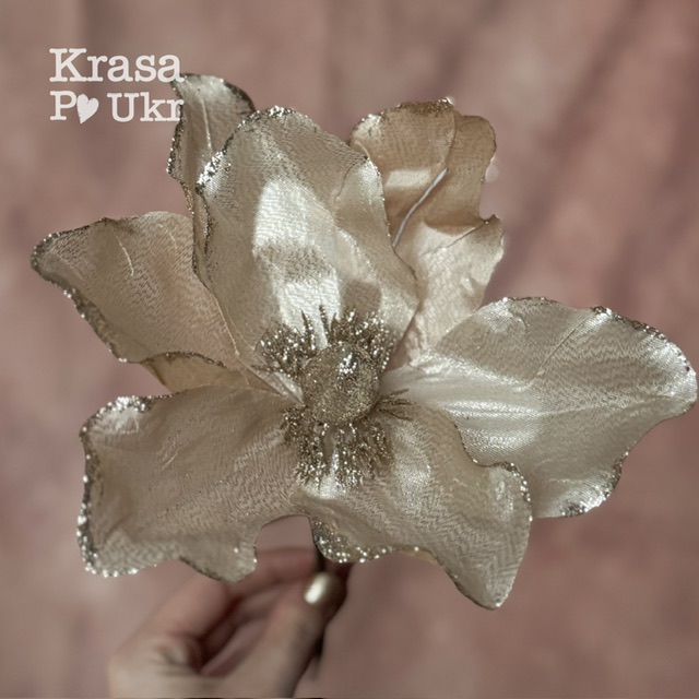 Новорічна квітка магнолія у відтінку шампань — це втілення ніжності, витонченості та святкової розкоші. Такий декор стане ідеальним акцентом у будь-якій новорічній композиції, на ялинці чи вінку. Її пелюстки мають покриття з легким блиском і гілтером по краях, завдяки чому квітка ефектно мерехтить при будь-якому освітленні, створюючи враження зимової інеєвої свіжості.
