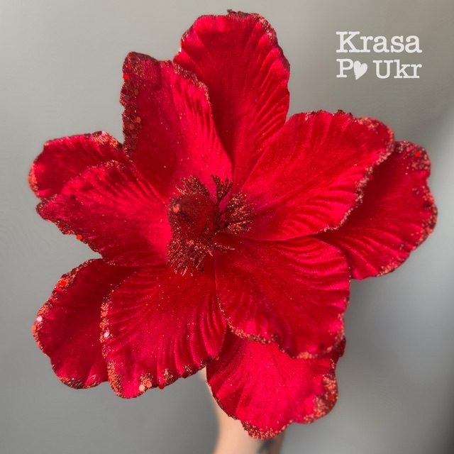 Пелюстки мають насичений червоний колір із глибоким королівським відтінком, який особливо виразно виглядає у поєднанні з зеленою хвоєю. Тканинна основа щільна, приємна на дотик, з легкою оксамитовою текстурою. Контури пелюсток прикрашені делікатним глітером, що створює м’яке сяйво й підкреслює структуру квітки. Ця блискуча обробка не надто яскрава, а збалансована — саме така, щоб виглядати дорого, елегантно та гармонійно у будь-якому декорі.