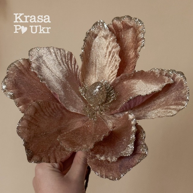 Квітка має гнучку ніжку, завдяки якій її зручно закріплювати в різних композиціях: на ялинці, у вінках, гірляндах, святкових букетах чи настільних декораціях. Вона чудово поєднується з іншими новорічними елементами — ялинковими кулями, ягодами, шишками та гілочками хвої. Виконана з бархатного матеріалу, магнолія виглядає стильно та святково, немов справжня квітка, що торкнулася зимового сяйва.