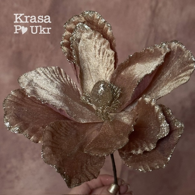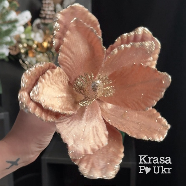 Новорічна квітка магнолія у відтінку карамельне лате — це вишукана прикраса, що додає тепла й елегантності будь-якому святковому декору. Її оксамитові пелюстки мають м’який пастельно-коричневий відтінок із легким підтоном у пудровий тон, а кінчики делікатно прикрашені блиском глітеру. Така комбінація кольорів створює ефект благородного сяйва, ненав’язливо підкреслюючи розкіш і затишок святкового оформлення.