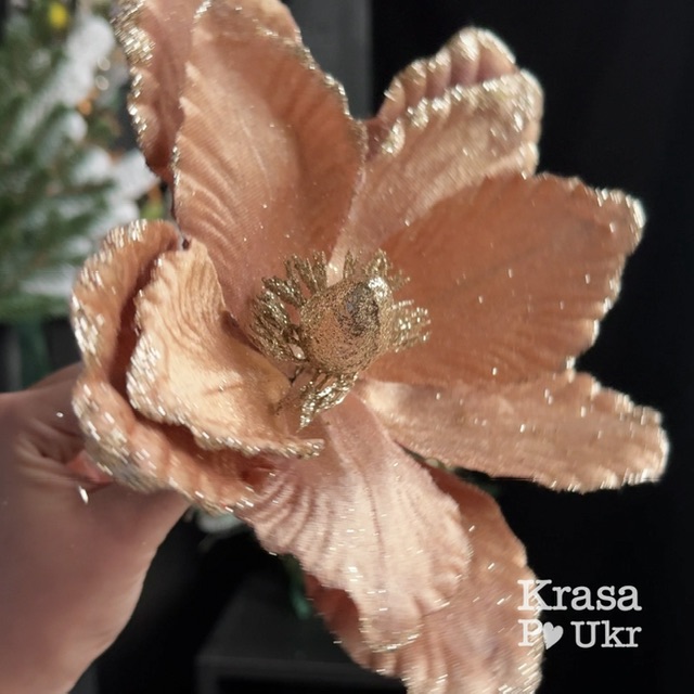 Новорічна магнолія 20 см з глітером на пелюстках, карамельне лате
