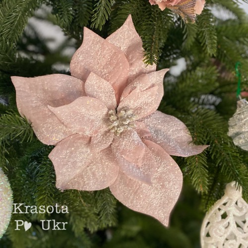 Новорічна “пуансетія пастель в снігу” з ніжкою 60 см, зефірного кольору у вазу