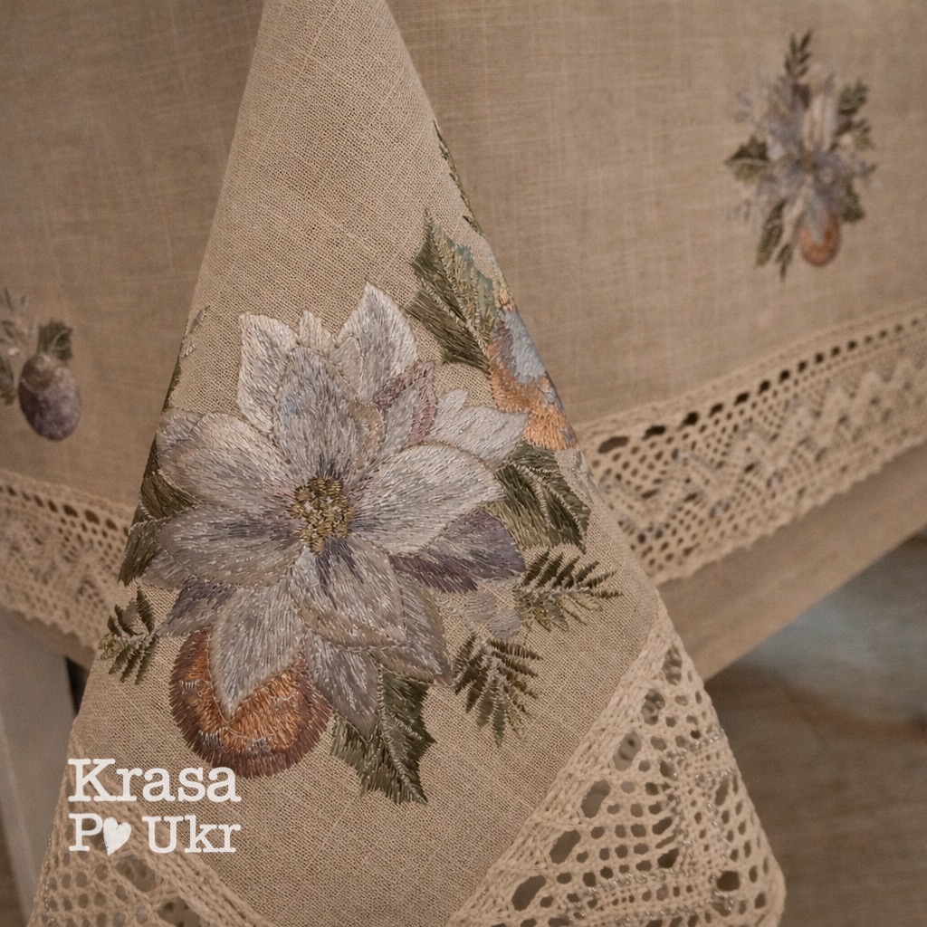 #132 Вишита скатертина “Різдвяна пастель” з мереживом і вишивкою — льон 110*160 см, 135*180 см,220*150 см