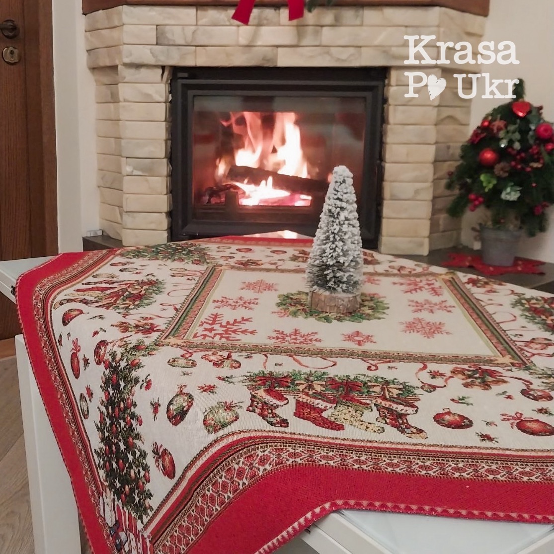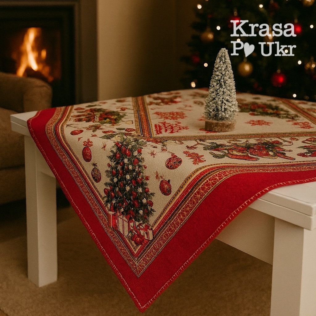 Скатертина виконана у класичній різдвяній кольоровій гамі: червоний бордер створює відчуття тепла, а центральна частина прикрашена тематичними зимовими елементами — ошатними ялинками, іграшками, подарунками, візерунками та декоративними мотивами, які ненав’язливо привертають увагу і створюють враження багатства та деталізації. Текстиль щільний, з приємною фактурою, чудово лежить на столі та гармонійно поєднується як з класичними інтер’єрами, так і з сучасним декором.