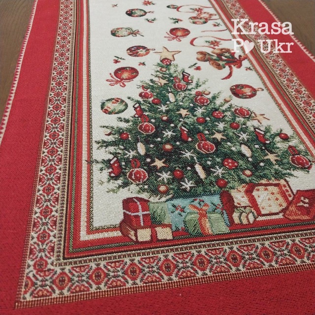 Основна частина раннера прикрашена класичною новорічною ялинкою з великою кількістю іграшок, подарунків і дрібних декоративних деталей, які додають особливої атмосфери. Доріжка виконана в глибокому червоному кольорі, що є традиційним символом Різдва, а центральна частина — світла, з деталізованим візерунком та святковими сюжетами.